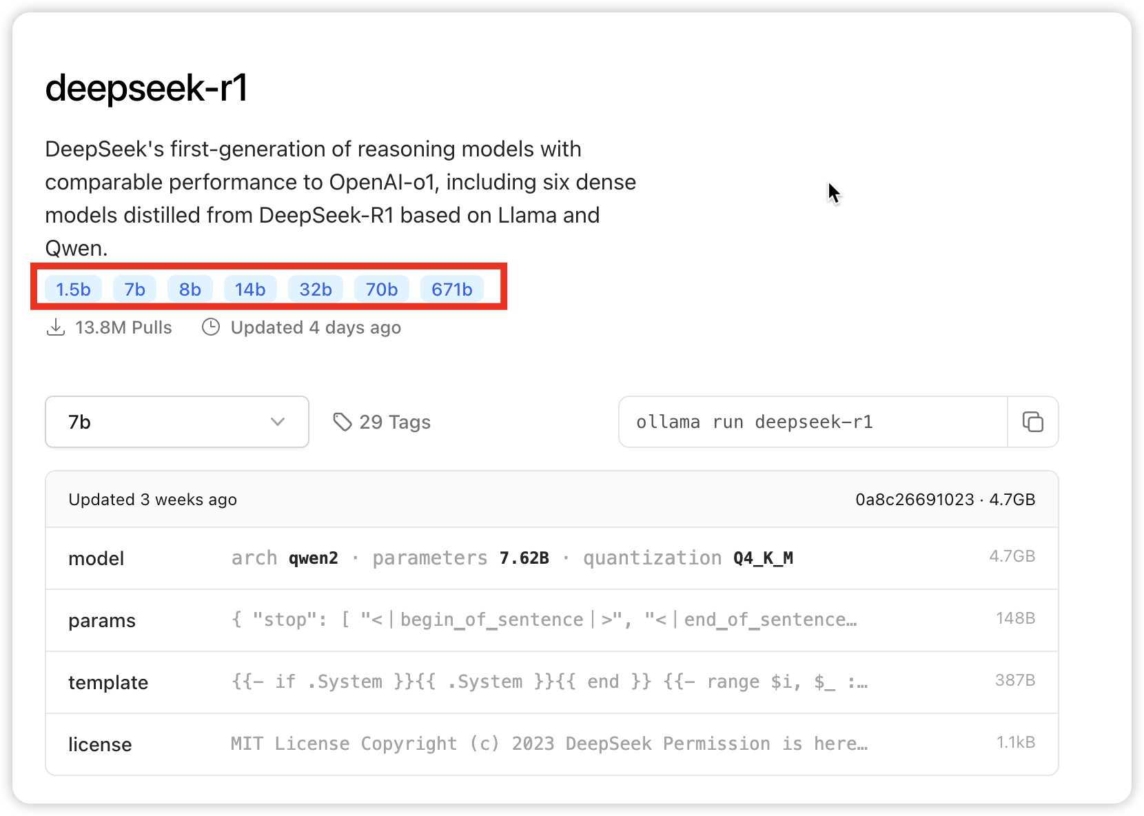 运行 ollama run deepseek-r1 命令默认安装的 7B 版本。