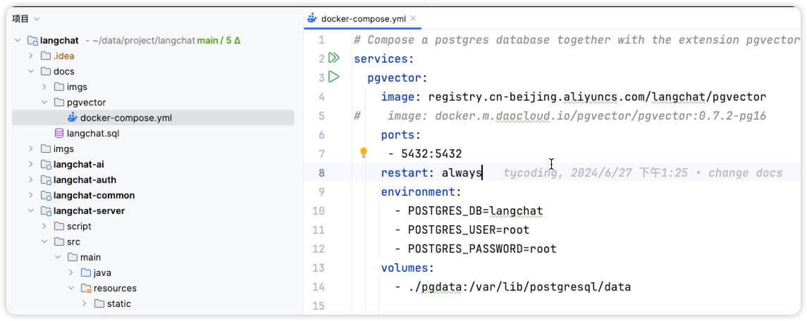 作者贴心的给大家编译了一个pgvector发布到了阿里云仓库,直接运行此compose也可启动,省去了上麦那一系列步骤