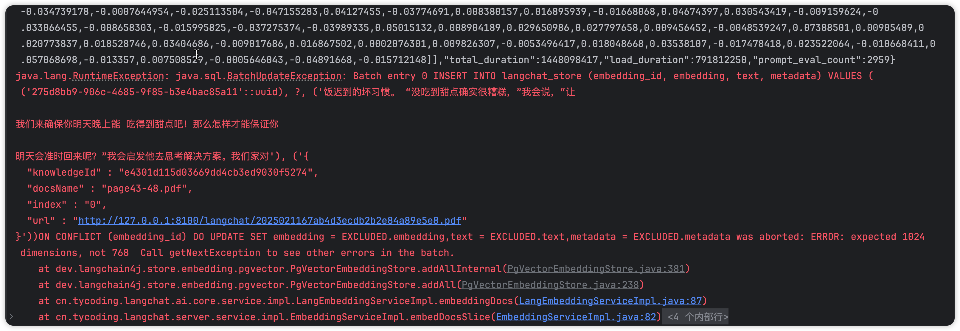 因为我们在LangChat配置的 1024向量纬度 的数据库,所以生成的表也只接收1024维度的数据。