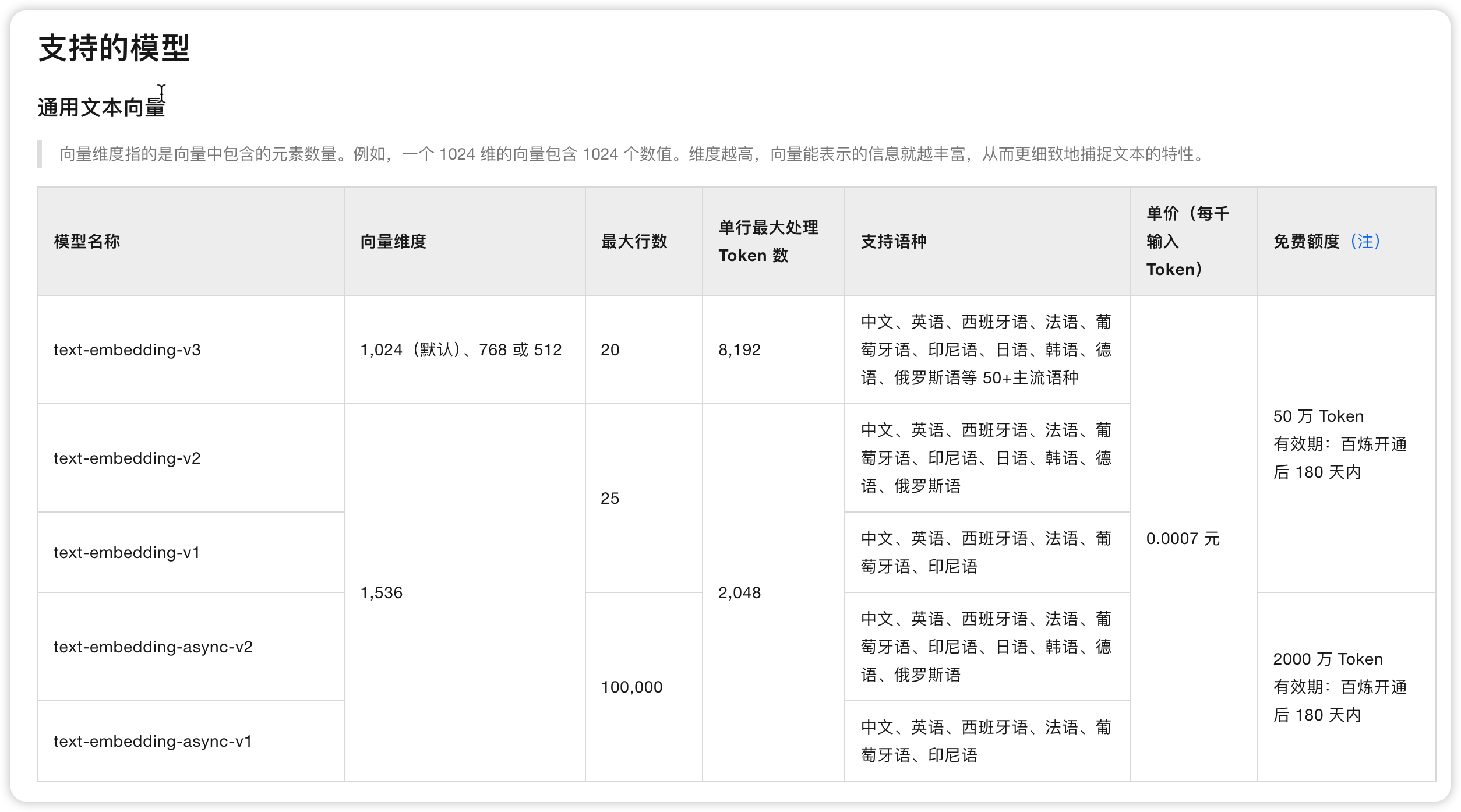 例如阿里云的文档中,关于Embedding模型的定义如下:(你在最初阶段就应该考虑哪种模型兼容哪种向量维度)