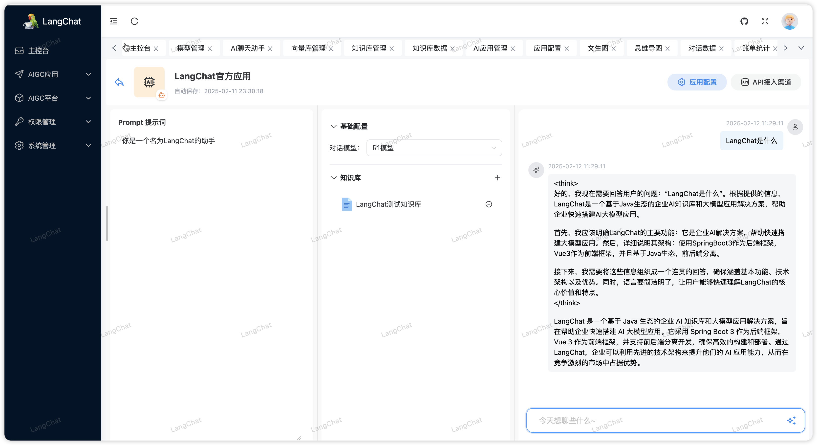 LangChat 是Java生态下企业级AIGC项目解决方案,集成RBAC和AIGC大模型能力,帮助企业快速定制AI知识库、企业AI机器人。